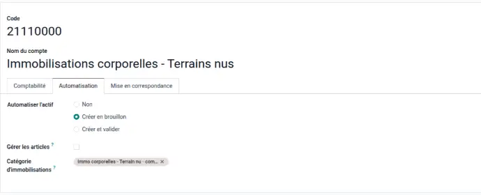 - Sur chaque compte d’immobilisation → onglet Automatisation → activer Gérer les articles.